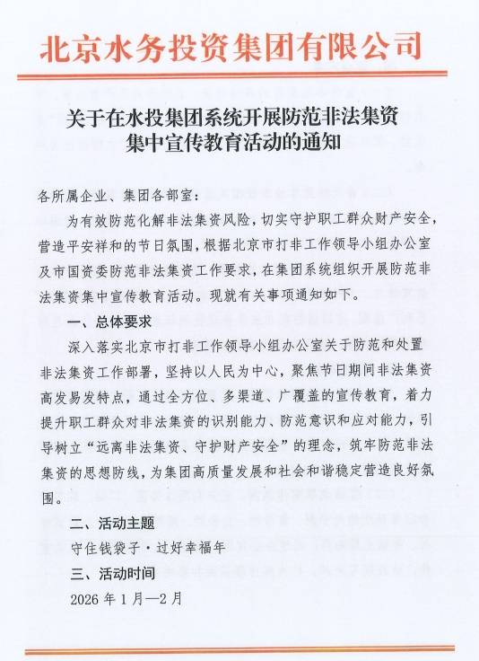 为有效防范化解非法集资风险,切实守护职工群众财产安全,营造平安祥和的节日氛围,根据市国资委工作要求,北京水务投资集团(下称“水投集团”)于近日在全系统组织开展以“守住钱袋子・过好幸福年”为主题的防范非法集资集中宣传教育活动。